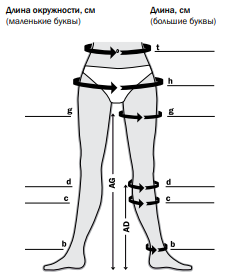 Для подбора чулок необходимо сделать замер (g) - длина окружности бедра на 5 см ниже промежности.